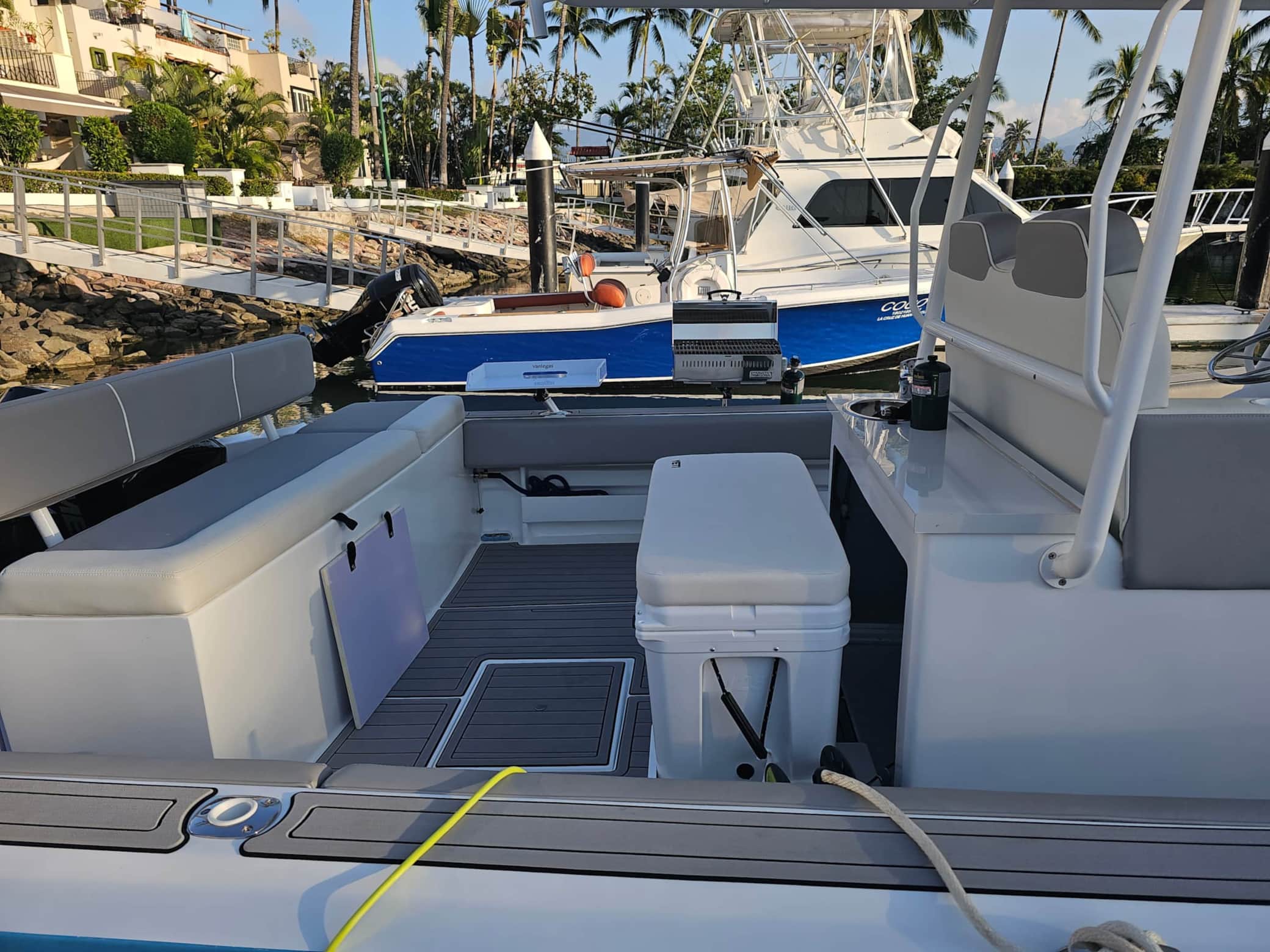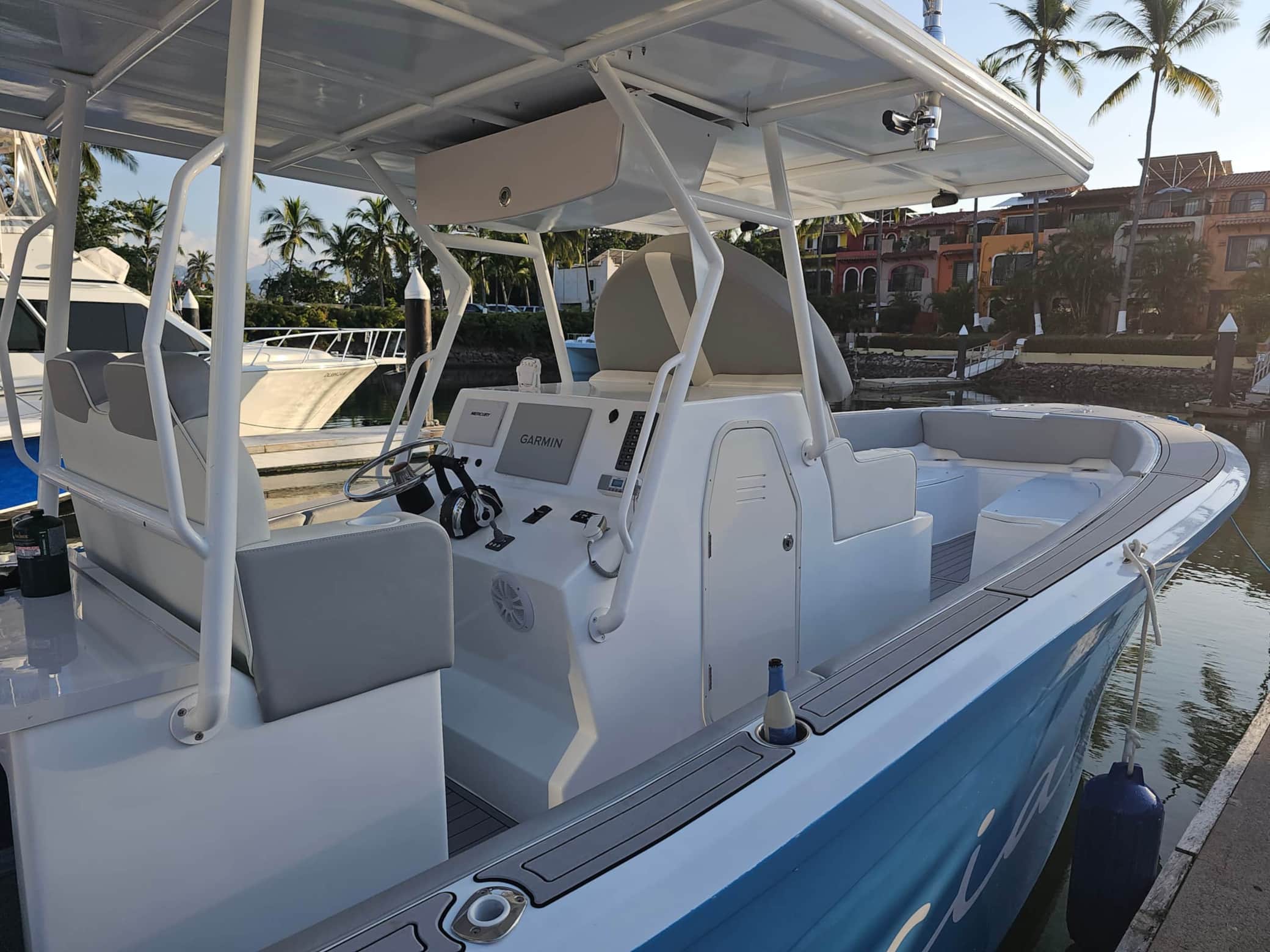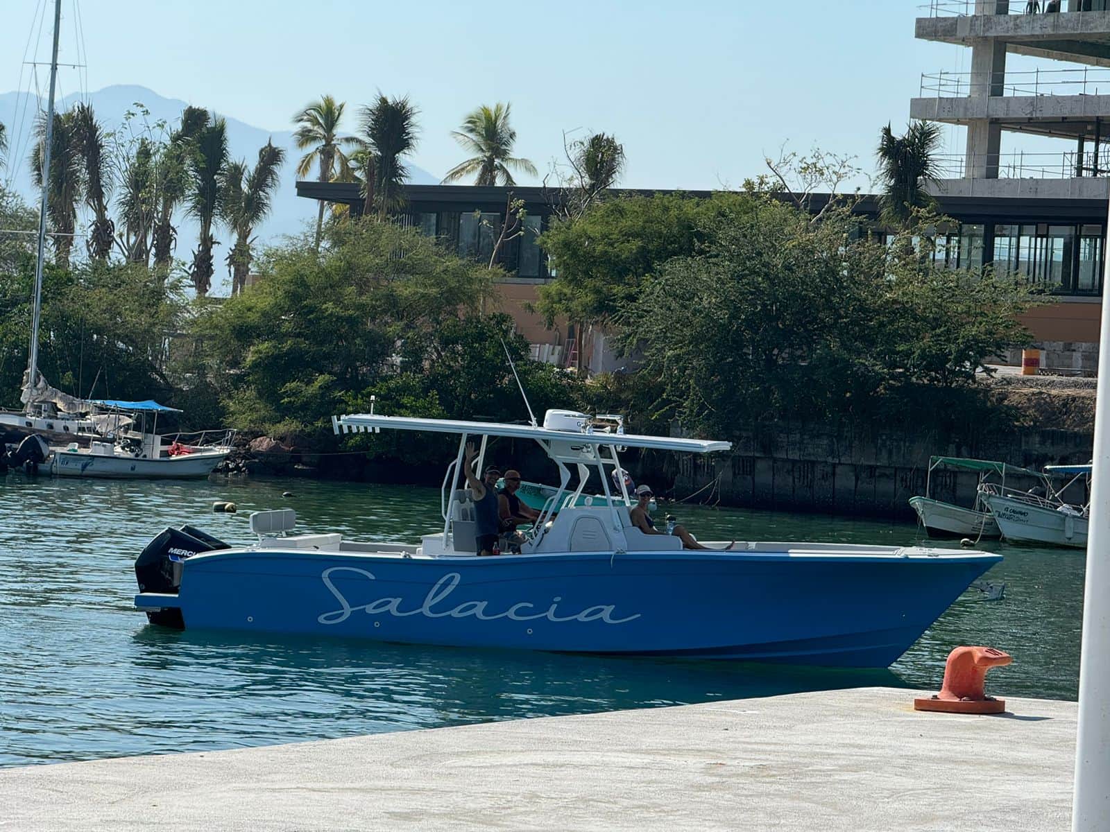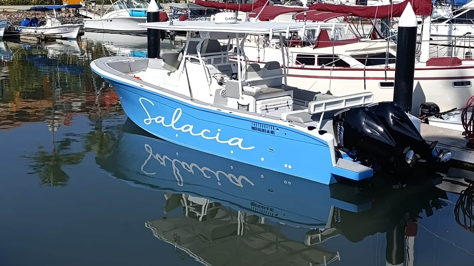 At 34', sporting twin 300HP Mercury engines, restroom, two sinks, live well, tuna tubes, fresh and salt water rinse, state of the art GPS and sonar systems, a large slide-out YETI cooler, and underwater lighting lounge seating, the Salacia offers the perfect balance between performance and recreation.